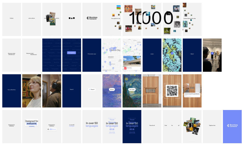 The animation highlights core app features including search, tours, multilingual audio support, QR-based discovery, video/audio content, and accessibility tools across 1,000+ cultural institutions worldwide.